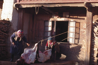 Varieties of ethnic clothing hang from the opposite walls. Besides typical domestic chores, the